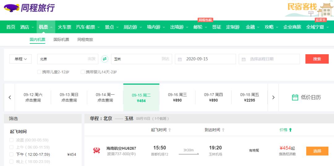同程网的航班信息返程上,北京飞玉林航班班次为HU6267,从首都机场起飞的时间为15:50,在玉林福绵机场降落的时间为19:20,同程网票价为454元、飞猪为460元。