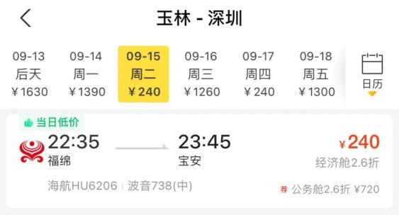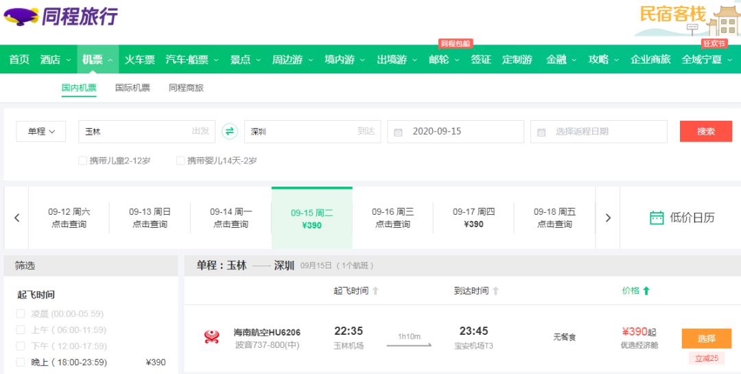 同程网的航班信息返程上,深圳飞玉林航班班次为HU6205,从深圳宝安机场起飞的时间为09:00,在玉林福绵机场降落的时间为10:20,同程网票价为390元、飞猪为280元。