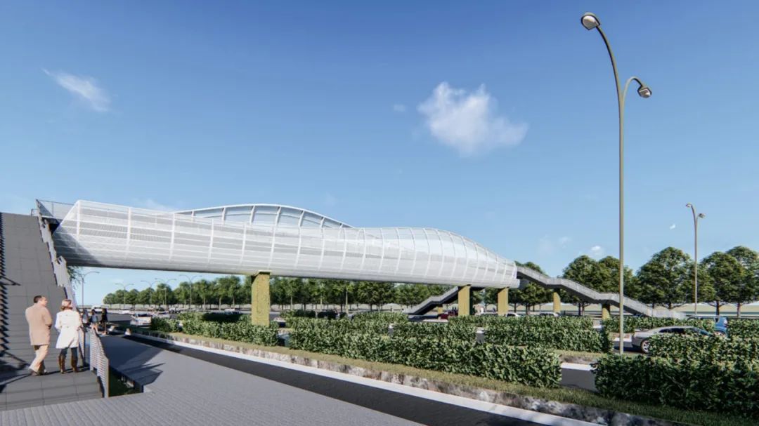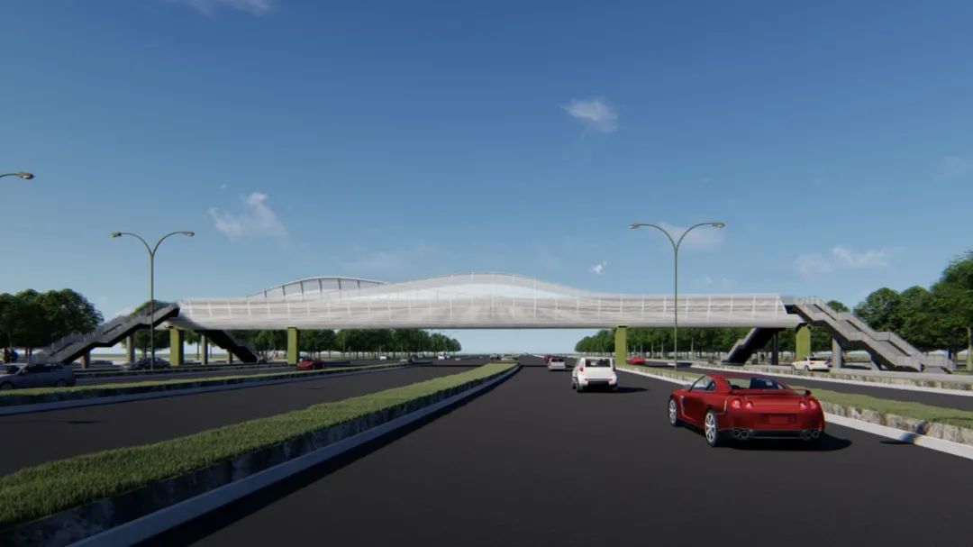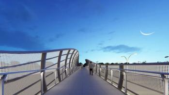 △一期工程效果图为配合金城路快速内环远期规划,人行天桥二期工程将会随着路面拓宽同步实施,届时天桥将向南延伸20米,最终桥面总长度将达到77米。