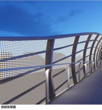 △一期工程效果图桥体呈椭圆包合状的曲面造型,整体线条灵动优美,仿佛在随着气流有机流动横向生长。穿孔板、玻璃栏杆的运用也给桥体增添了轻盈朦胧之感,同时充满了层次感和科技感。