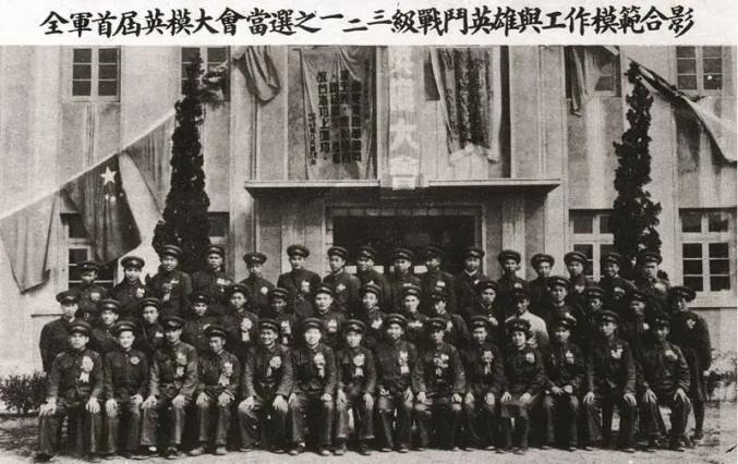 1950年,杨根思参加全国英模大会后与战友合影(前排右二)1946年,国民党公然撕毁停战协定,准备进攻解放区。在围歼泰安守敌的战斗中,杨根思冲在最前面,眼睛受伤不下火线,用18颗手榴弹歼灭屋顶的敌人,占领制高点,帮助部队取得胜利,再次被评为战斗模范。
