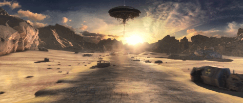 循着甲壳虫的飞行轨迹,一个长镜头,揭开了末日黄沙的故事背景。