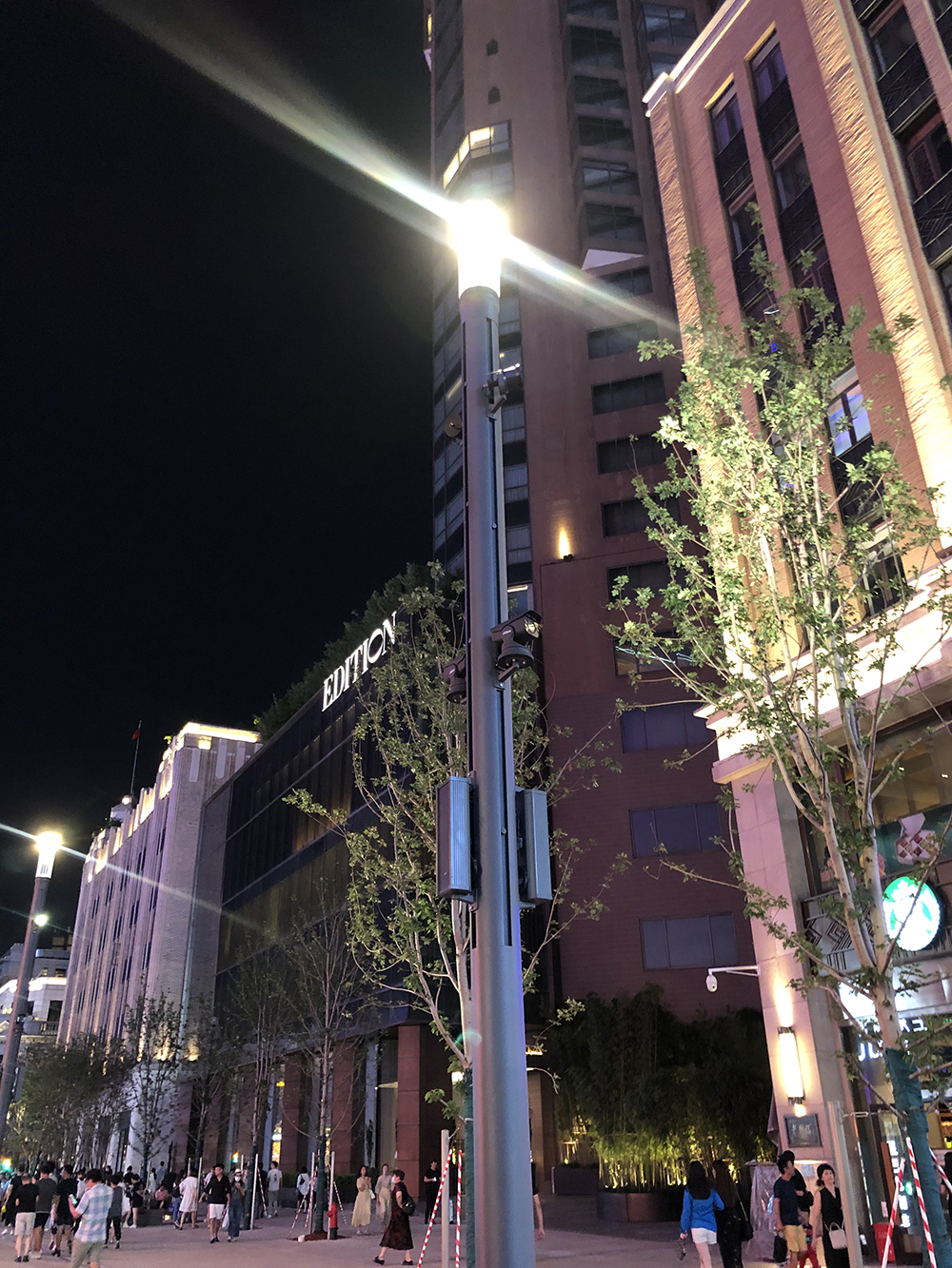 在东拓段,30盏间距14米左右的深灰色铸铁灯柱同样竖立在街道中央,延续“金带”的设计理念并加以创新。这一排综合灯杆,归并了原来沿街两侧的灯杆功能,同时还搭载了通信信号塔、5G系统、监控系统、广播系统等功能。