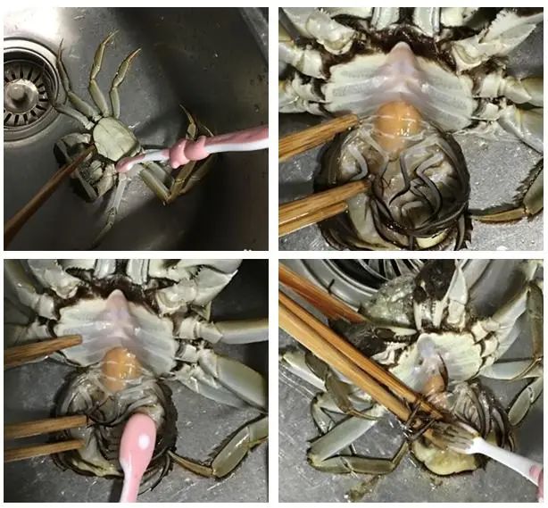 ①用筷子夹出一个浸泡过的大闸蟹,把腹部朝上,用筷子压住,别让它乱动,用刷子把整个腹部和脚一个一个地刷干净。②用筷子把腹盖打开,拿另外一对筷子双重压住,用刷子把里面的脏东西刷干净。