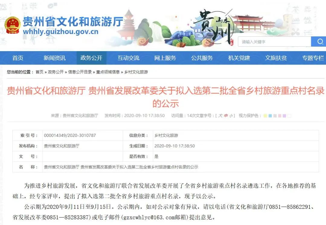 公示期为2020年9月11日至9月15日。公示期内,如对公示对象有异议,请以电话(省文化和旅游厅0851—85862291、省发展改革委0851—85283387)或电子邮件(gzxcwhlyc@163.com邮箱)提出意见。