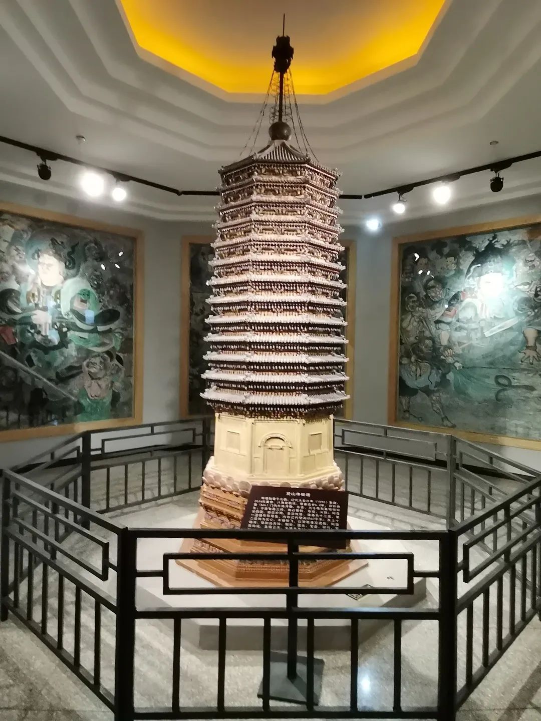 塔室内的八面墙壁上有辽代壁画,内容为明王。据了解,辽代壁画多见于墓葬,寺观中保留极少,此壁画为研究辽代壁画提供了珍贵的实物资料。在灵丘博物馆中,记者见到了觉山寺砖塔模型与辽代壁画复制图。图画上的明王头发上冲,上身袒露,怒目而视,獠牙外露,整个画面灵动飞舞。