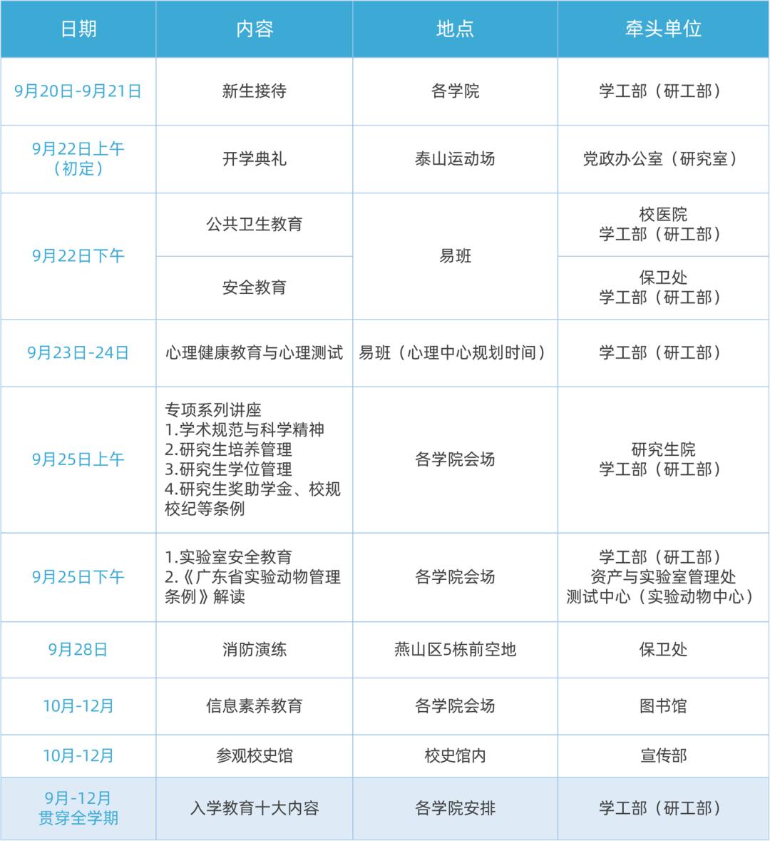 研究生新生报到日8:00-18:00开放西南门、汇景北门、西门等3个学生入校入口;18:00后,仅开放西南门。