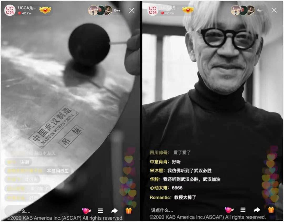 作为这场音乐会的特邀嘉宾,坂本龙一用刻有“中国武汉制造”的吊钹和回收医用橡胶制成的马林巴槌,演奏了一首特别的音乐,表达了对疫情下中国的关怀。