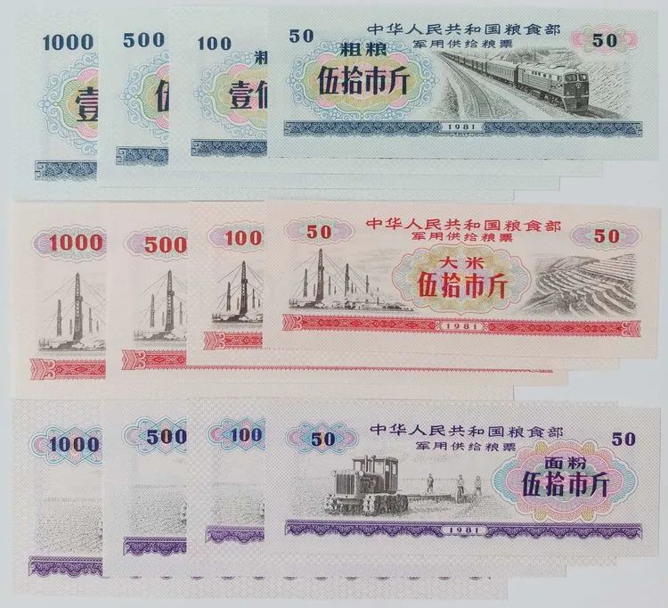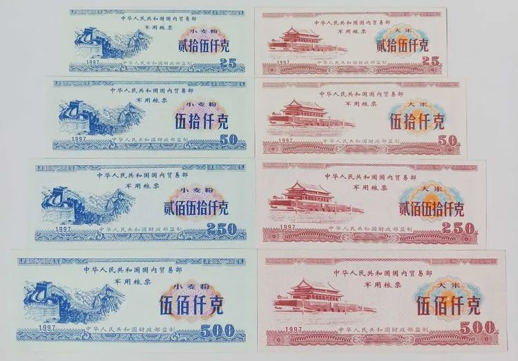 1、1997年,全国军用粮票,全套8枚。1993年,全国各地基本上停止使用粮票,但军队情况特殊,依然在使用粮票。