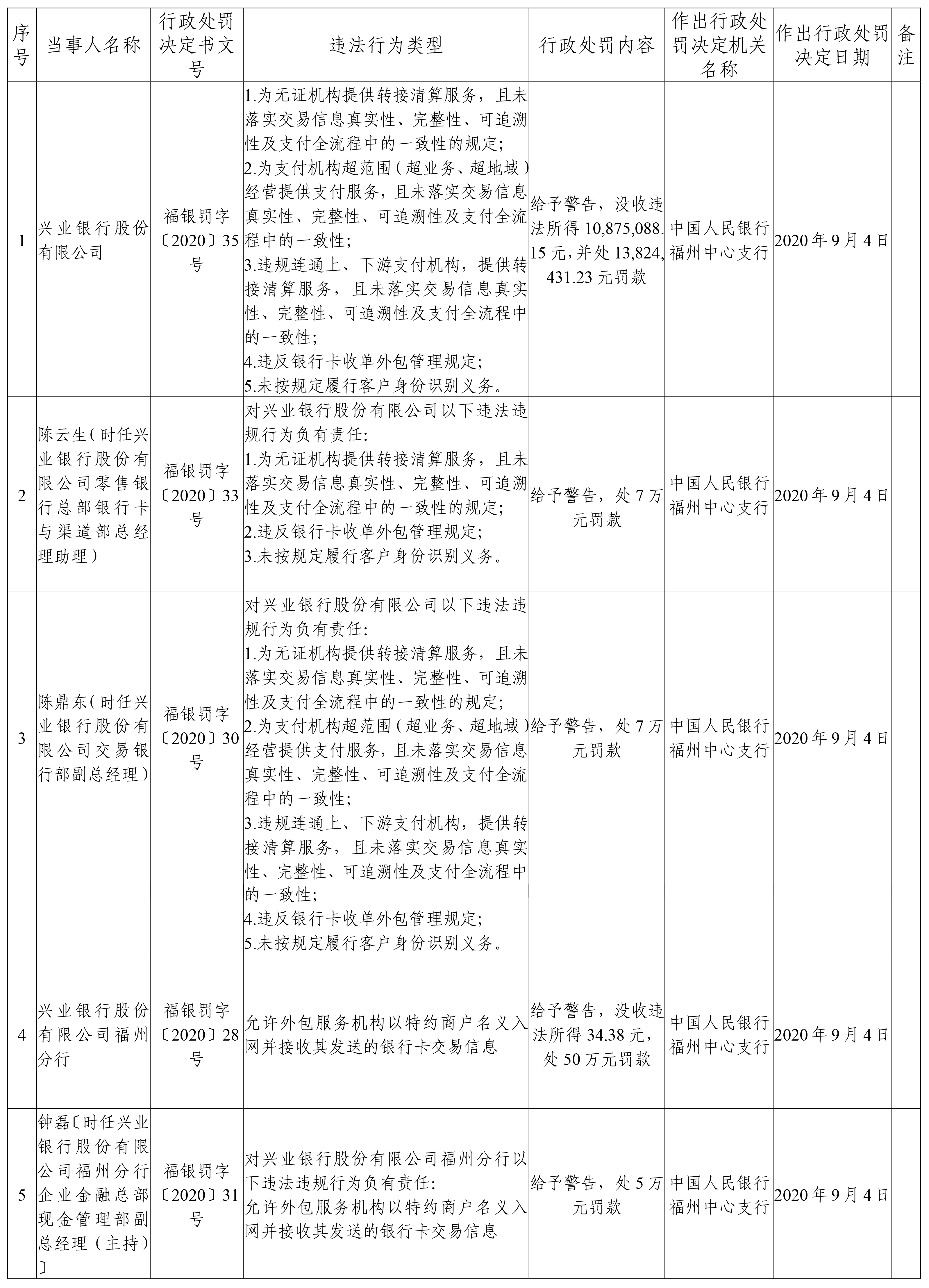 9月11日,中国人民银行福州中心支行披露的处罚信息公示表显示,兴业银行被给予警告处分,没收违法所得1087.51万元,并处1382.443万元罚款,共罚没2469.953万元。处罚时间为2020年9月4日。同日,兴业银行福州分行也被警告处罚,没收违法所得34.38元,处50万元罚款。