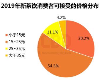 NCBD(餐宝典)的数据显示,2019年新茶饮消费者可接受的价格方面,15~25元的占54.5%。这个价格区间也成了很多茶饮品牌的“必争之地”。