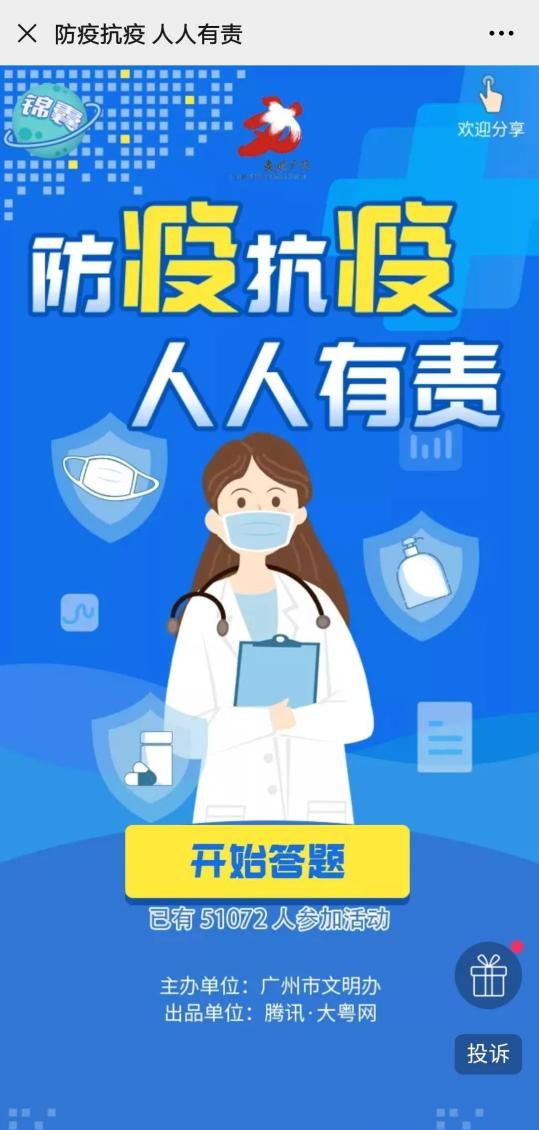 简介:“防疫抗疫 人人有责”H5问答活动共140道题库,涵盖日常防护知识,到复工复产规范,到相关法律条文等方面。活动通过腾讯全渠道、文明号成员及自媒体渠道推广的传播方式,达到最佳宣传效果,答题人数超过5万。