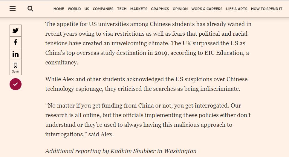 本月8日,《金融时报》报道称,由于签证限制,以及担心政治与种族关系紧张所造成的不友善气氛,美国对中国留学生的吸引力近年来已经下降了。现在英国成了中国留学生的首选(报道截图)其次,欧盟自进入二十一世纪以来,频频发生危机,一波接一波:2009年主权债务危机、阿拉伯之春引发的难民危机、2016年英国脱欧和民粹主义全面崛起、2020年新冠危机。欧元区用了足足十年才走出2008年的全球危机,意大利则一直都没有走出来,然后就遇到了更大的打击:新冠疫情。
