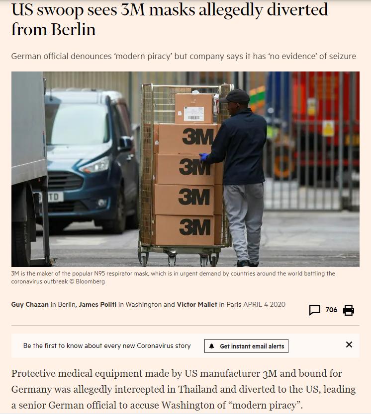据《金融时报》报道,今年四月时一批原定于送往德国的美国3M公司的N95口罩在曼谷被美方拦截并运往美国。一名德国高级官员谴责美国的做法宛如“现代海盗”。(报道截图)这样的美国,欧盟其实内心是十分清楚的。