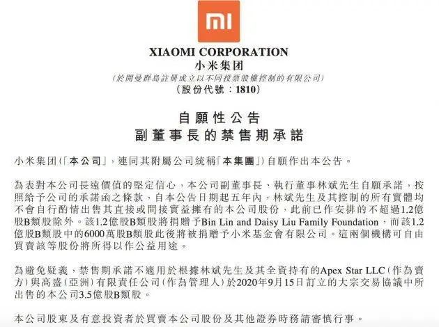 9月15日今日早间,小米集团发布公告强调,自发布之日起,该公司副董事长、执行董事林斌将按照承诺函条款在未来五年内不会自行出售其拥有的直接或间接公司财产以及股份,此前已安排捐赠给家族慈善基金的1.2亿股B类股除外。