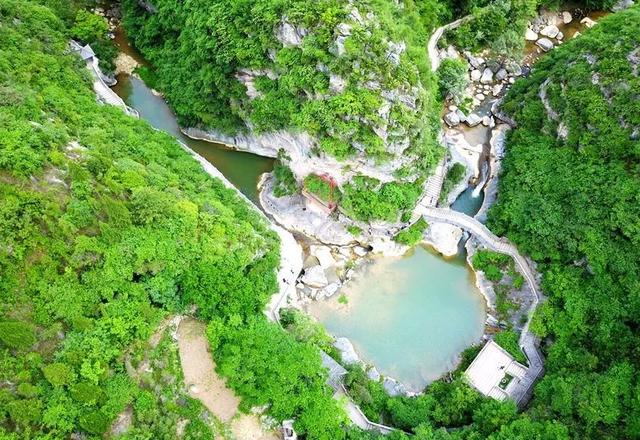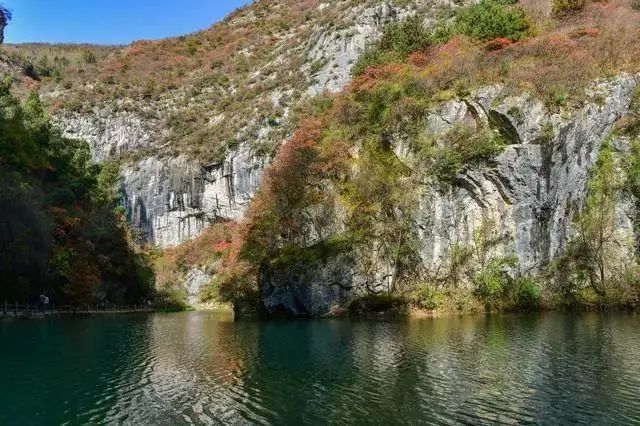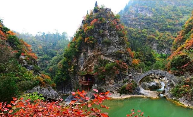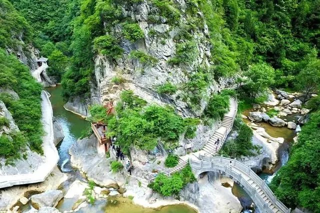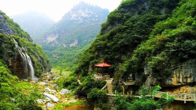 峡内的山、水、石、树,皆成风景;亭、桥、廊、榭,相映成趣。抬眼望去,一边是拔地而起的高山,一边是错落有致的悬崖。山崖上色彩斑斓,其间亦或有古树参天,老藤缠绕。两山之间的响水河,或在峡谷中潺潺绕行,或在巨石间冲腾奔泻,浪花激起的水声,站在远处也能听到。更有意思的是悬崖上的水,或化成一条白练从高处垂落而下,或从栈道上方形成珠帘,飞溅滴注,蔚为壮观。