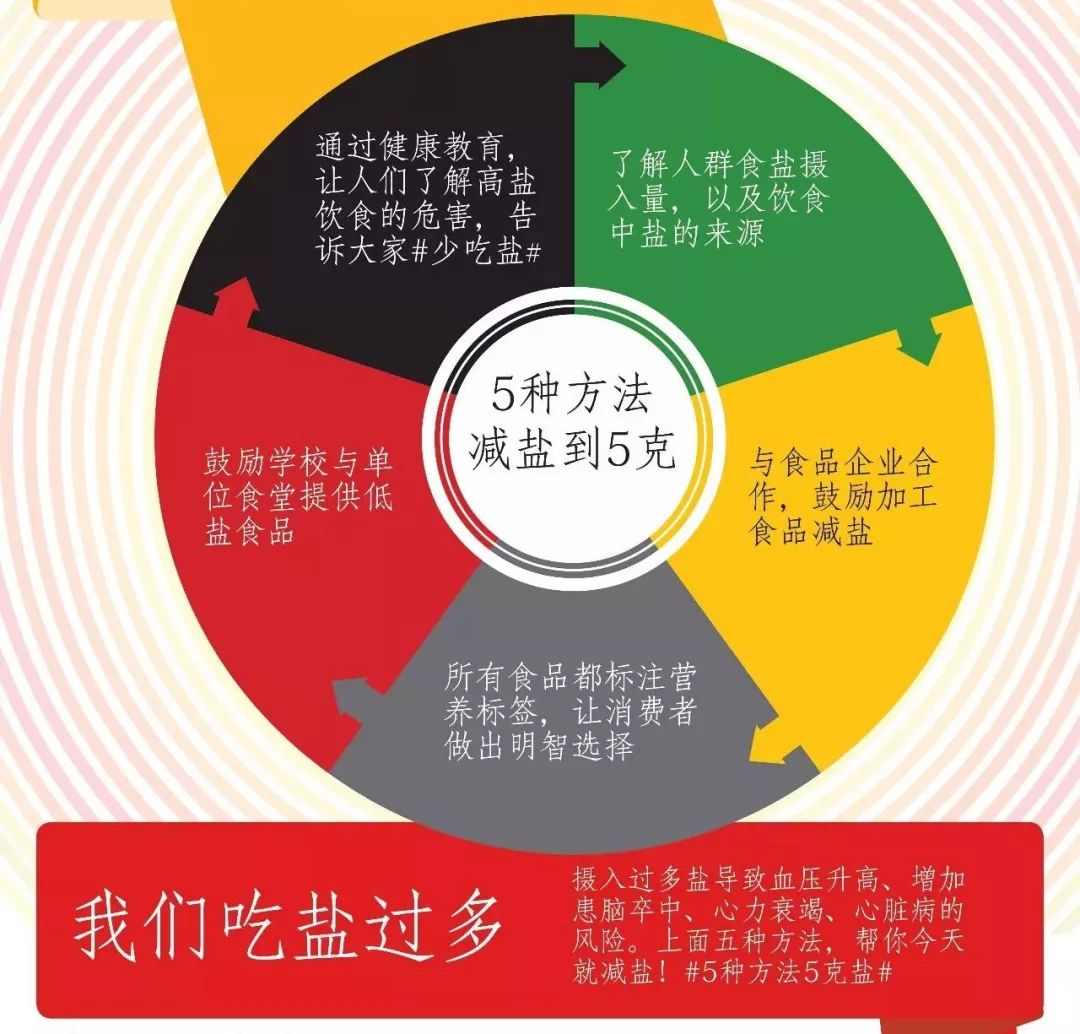 5.鼓励学校及工作场所食堂提供低盐食品。