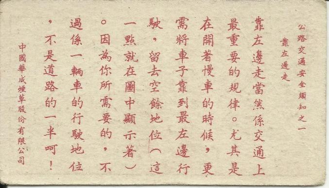 民国时期华成烟草股份有限公司印发的交通安全宣传照片。该烟片的正面印有须知“靠左边走”,背面用文字作了详细说明:“靠左边走当然系交通上最重要的规律。尤其是在开着慢车时候,更需要将车子靠到最左边行驶,留去空余地位。因为你所需要的,不过系一辆车的行驶地位,不是道路的一半呵。”最后一句让网友大呼“雷人”。