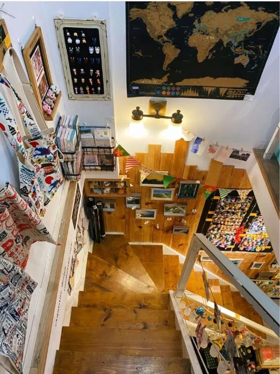 左手边有好多手办!还有小卡片、御守、耳钉饰品、徽章,很有日本本土店的感觉。一楼到二楼之间的楼梯墙面上,有很多小手办、冰箱贴、小玩偶,以及老板周游世界的照片。