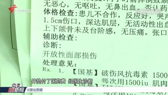 侯先生说,他是在9月3日中午,突然接到了幼儿园通知,说孩子摔伤了。他说,幼儿园的老师和校医就告诉孩子奶奶,说孩子是在奔跑的途中,磕伤了下巴,当时他们也没怀疑什么,第一时间是相信老师的。事发后,幼儿园第一时间将孩子送到医院并垫付了医药费。经医生诊断,孩子属于开放性面部损伤,伤口宽1.5厘米,深度已达肌肉层。