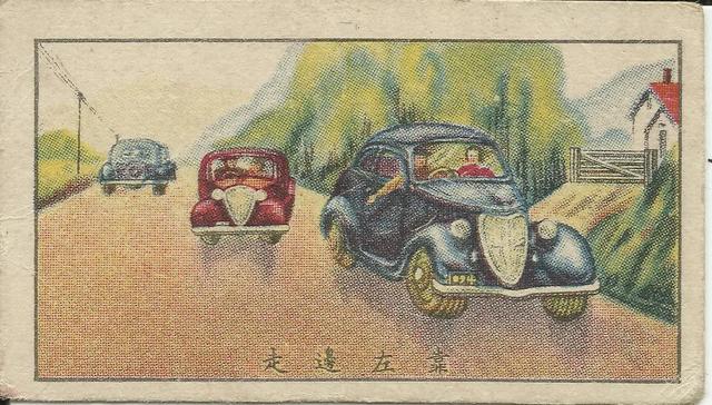 1934年12月,第一个全国性交通法规《陆上交通管理规则》颁布,实行左行通行制。民国华成烟草公司印发的交通安全宣传烟片(共30枚),其中第一枚就见证了这一通行规则。