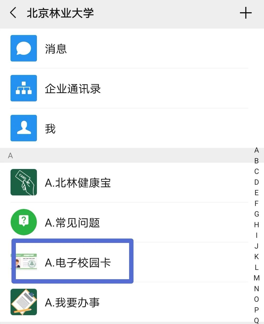 step 01. 在微信APP中点击下方“通讯录”,在我的企业中点击“北京林业大学”,然后点击“电子校园卡”