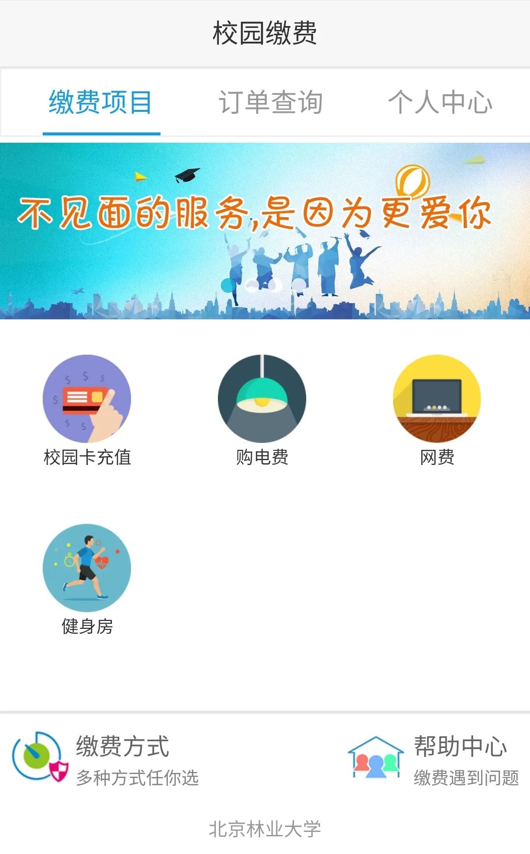 或在“北京林业大学”企业号中点击“生活缴费”;或直接输入校园缴费平台网址:
