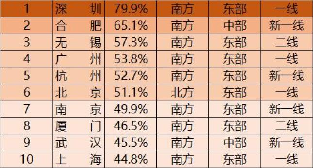 前三档的13个城市中,南方城市占77%,只有北京、济宁、唐山是北方城市。东部城市占85%,只有武汉、合肥是中部城市。