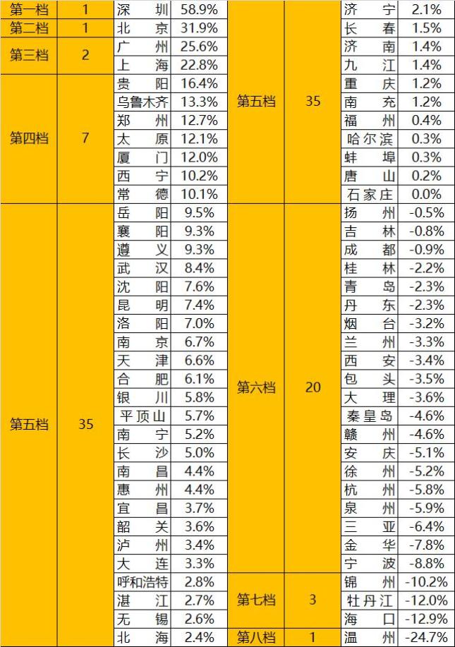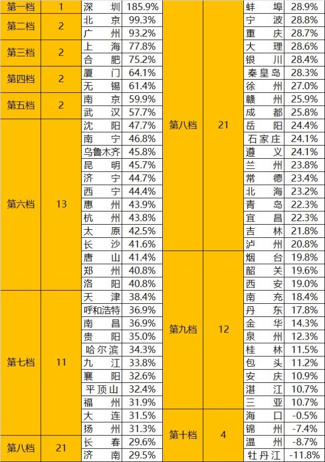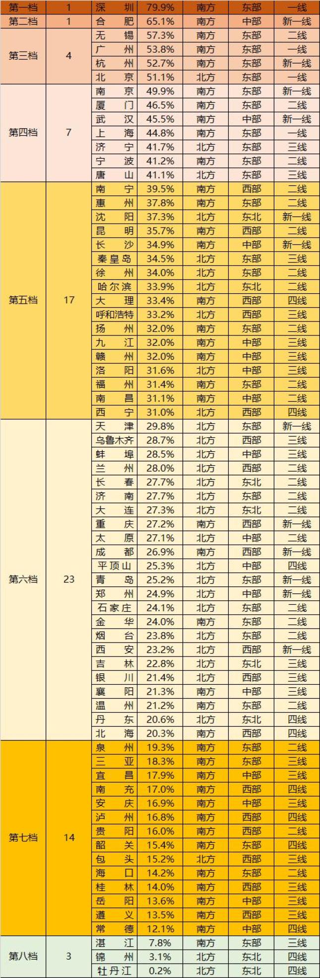 大部分城市落在第五档、第六档,数量最多,一共有40个。这些城市,算是不温不火,是“橄榄型”的中层地带。