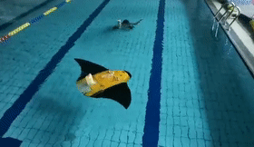 科研人员介绍,这条“魔鬼鱼”叫蝠鲼,是一种生活在热带和亚热带海域底层的软骨鱼类,因其恐怖的外形而被称为“魔鬼鱼”。西工大游泳池里正是一条仿蝠鲼智能水下航行器。