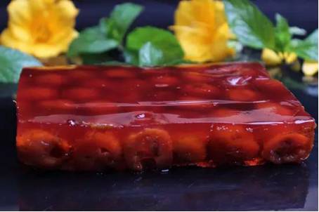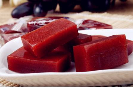 山楂糕也叫金糕,后来的山楂片、果丹皮等零食其实都算是山楂糕的衍生物。山楂糕的制作工艺不复杂,但是挺费功夫的:把山楂去核熬成果泥,加入用大量白糖煮成的糖浆混匀冷却,再加桂花调味。现在生产的山楂糕里很多都放了琼脂帮助凝固,古时是加明矾,明矾能和果胶反应生成果胶酸盐凝胶,还能让山楂糕颜色更红亮。加矾做的山楂糕含水量高,天热了就会垮塌,只能卖到开春,而加琼脂做出来的就比较稳定,到夏天都能照卖不误。《遵生八笺》里还说可以加檀香木屑做出来香喷喷的檀香味山楂糕,反正我想象了一下,不太想吃这种牙碜糕。