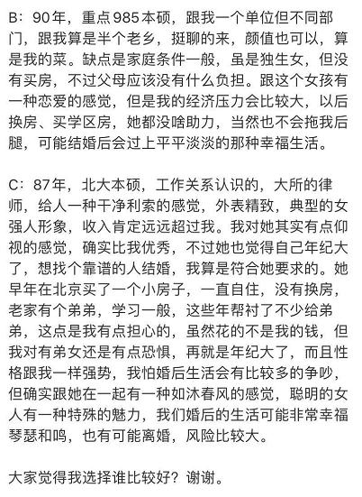 提及第三个女孩,人家收入比他高,也比他优秀,很早就买了房子,但因为女孩帮衬弟弟且性格强势(其实人家可能就是比较有主见),所以他很担心将来两个人在一起后,会离婚。