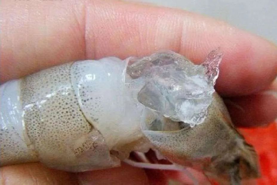将虾头掰下,剥开虾壳仔细观察,如果虾肉看上去透明鲜亮,没有半透明物,就是正常的,若发现虾肉上有黏性的果冻状物质,则不正常。