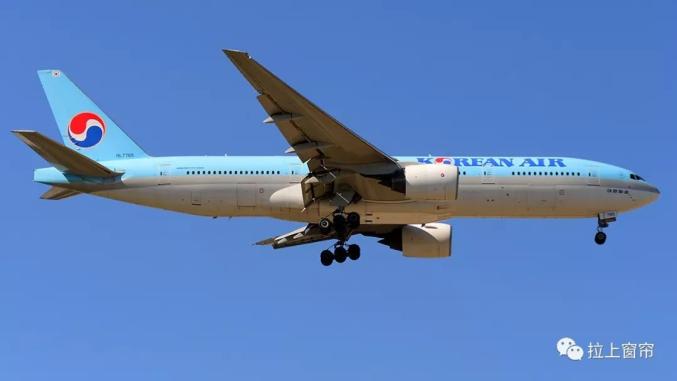 图:大韩航空777-200ER,注意翼尖区别 摄影:拉上窗帘波音的原意是要777替代767,但是加长机身加大动力之后,777-300ER的载客量和航程都跨到了747家的园子里,这也是一代女王衰落的原因之一。