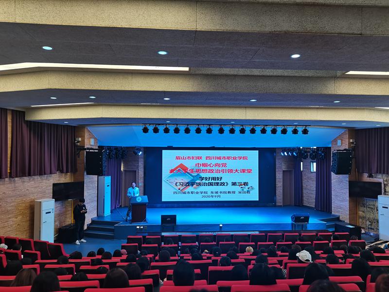 为进一步加强对女大学生思想政治引领,让习近平新时代中国特色社会主义思想在女大学生中入脑入心、落地生根,9月18日上午,眉山市妇联、四川城市职业学院联合举办的“巾帼心向党----女大学生思想政治引领大课堂”开讲。东坡书院宋田桂教授围绕《习近平谈治国理政》(第三卷)和眉山市委四届十五次会议精神,为四川城市职业学院眉山校区的250余名女大学生进行了宣讲。