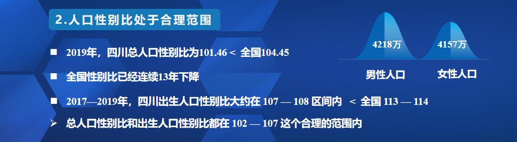 在出生人口方面,2017—2019年,我省出生人口性别比在107—108区间内。“总人口性别比和出生人口性别比,都在102—107这个合理区间。”陈智说,这个数据也证明了四川“重男轻女不严重”。