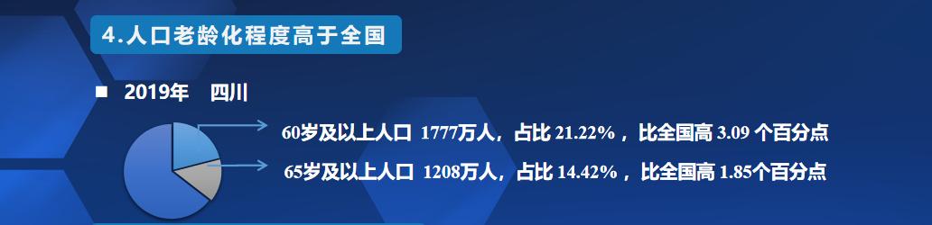 2019年,四川省65岁及以上人口1208万人,占比为14.42%,比全国高1.85个百分点。