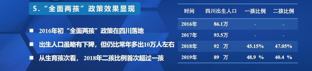 2016年初,“全面两孩”政策在川落地,2017—2019年四川出生人口分别达到93.5万、92万、89万,其中,2018年,二孩比例首次超过一孩。