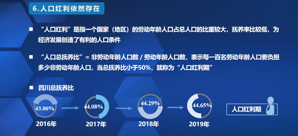 数据显示,我省2016年的“总抚养比”为43.06%,之后逐年上升,到2019年达到44.65%,人口红利依然存在。“由于老龄化程度的加深,总抚养比正在不断提高,逐渐接近50%。”
