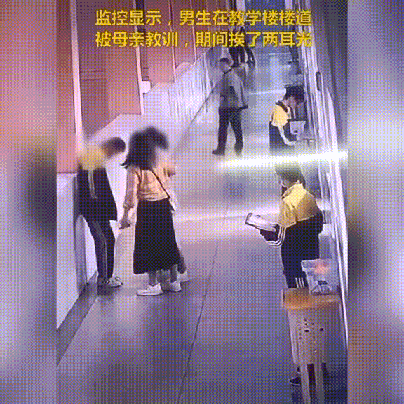 这个男生叫张某锐,母亲来到学校后,在五楼的走廊里扇了他两耳光。