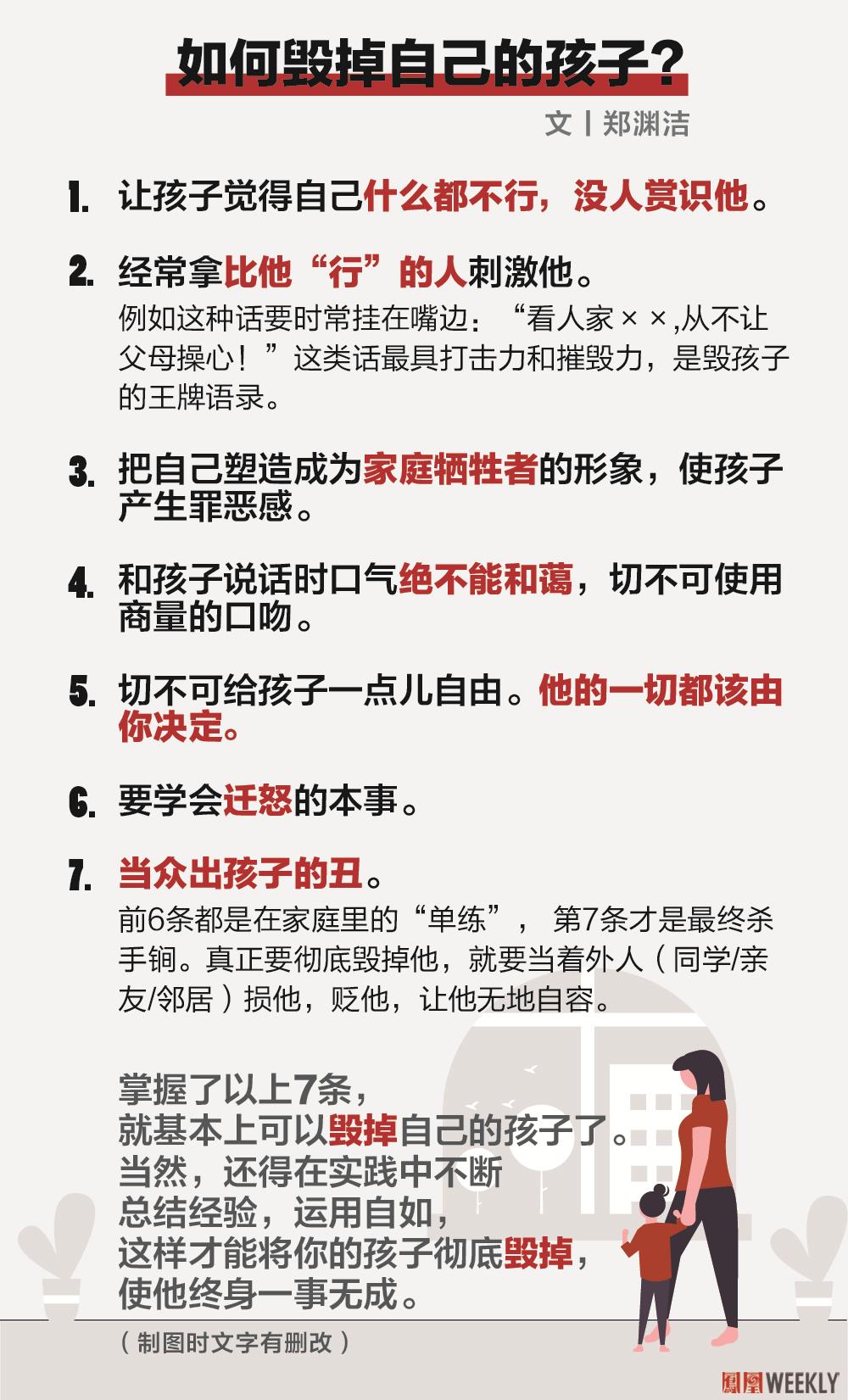 不止是张某锐一家这样,郑渊洁总结出“如何毁掉你的孩子”中的杀手锏——“让他当众出丑”,正是很多中国家长最爱干的事。