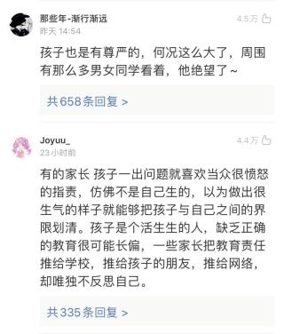 而在张某锐事件的新闻评论区,很多网友也都指出了一点:整件事最糟糕的地方在于,他母亲忘记了,孩子也是有尊严的,母亲当着全班同学的面大声斥责他,还扇巴掌、掐脖子、推脑袋,这实在是太侮辱人了。