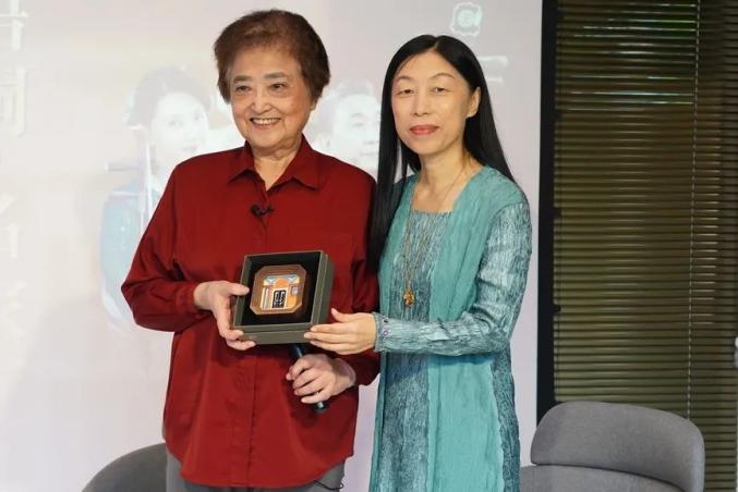 区委常委、宣传部部长吕晓慧(右)向俞丽拿赠送文创品