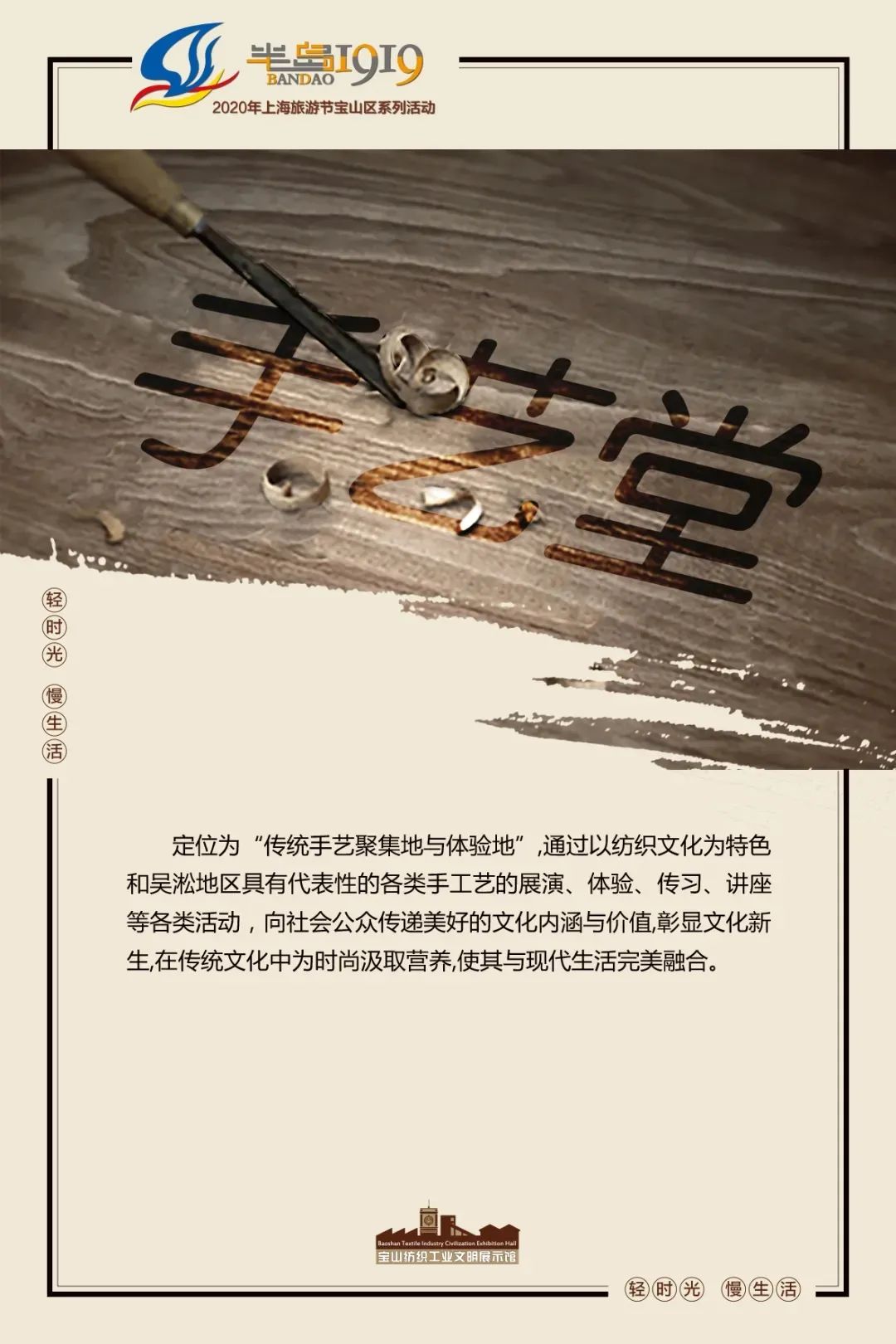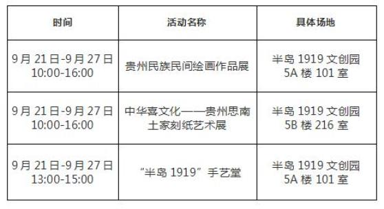2020年上海旅游节期间,半岛1919将推出以“工业文明、时尚生活”为主题的“半岛1919工业文明体验季”系列活动。除贯穿多号楼的半岛1919微旅行外,5号楼还将举办贵州民族民间绘画作品展、中华喜文化——贵州思南土家刻纸艺术展和“半岛1919”手艺堂3项特色活动。