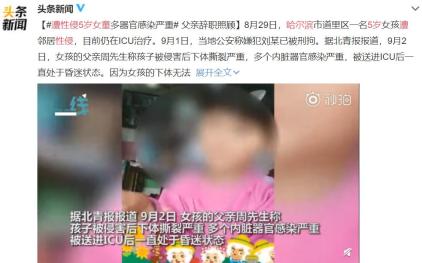 前段时间,哈尔滨5岁女孩被54岁邻居带走一夜,次日被送回家中时,家长发现全身是伤,并且下身撕裂严重。