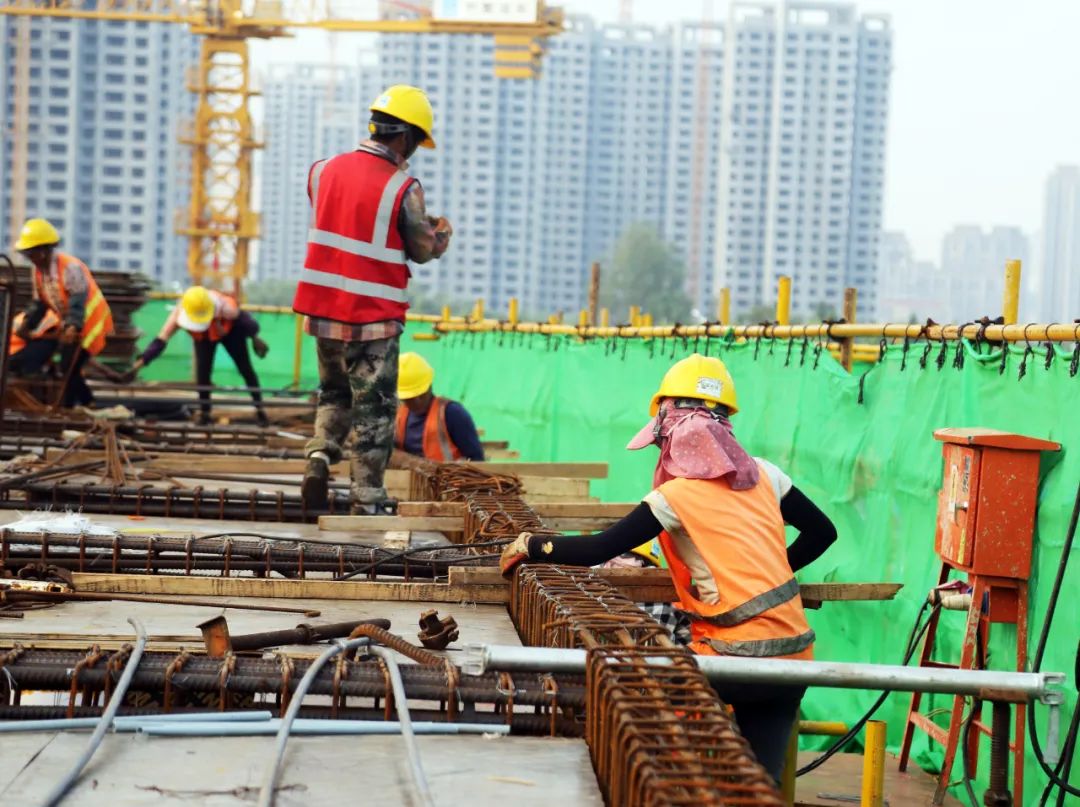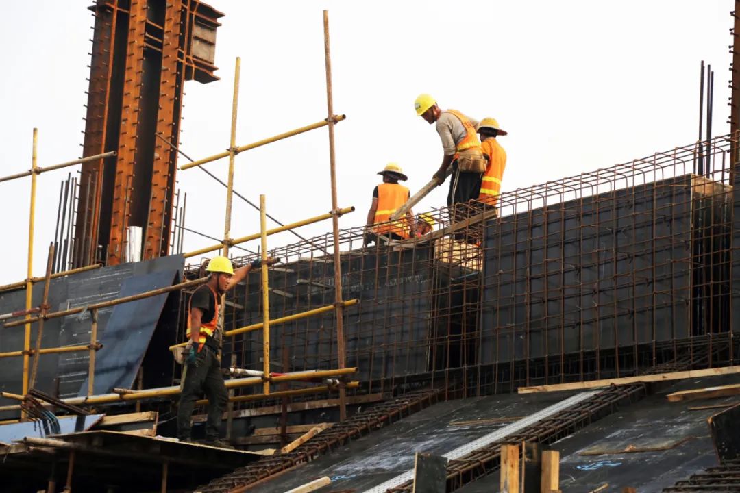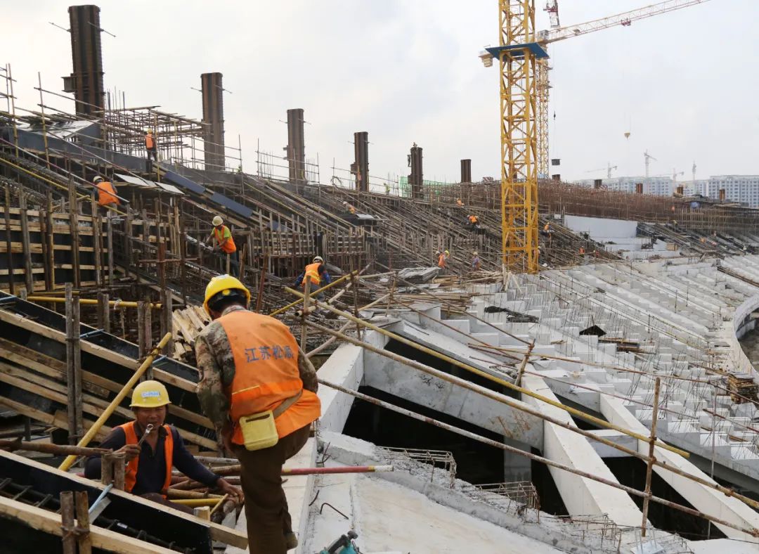 近日,记者在日照奎山体育中心工地现场看到,硕大的体育场主体已经初具规模,几十根钢结构像定海神针一样矗立在体育场之内,塔吊车不停地摆动工作,场面十分震撼。虽然近期雨水天气较多,气温逐渐转凉,但在日照奎山体育中心的施工现场内工人们正热火朝天地忙碌着,几百名工人齐发力,钢筋绑扎安装、混凝土二次抹压、临边防护脚手架搭设、防水卷材铺贴等一系列施工同步进行,现场一派繁忙景象。