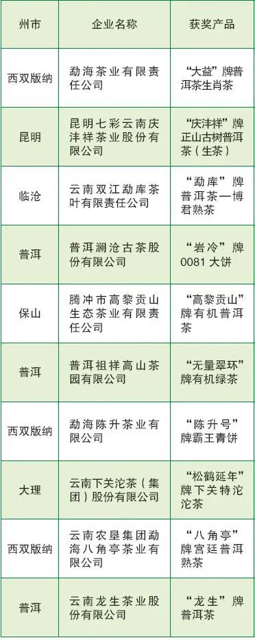 2020年云南省“10大名茶”