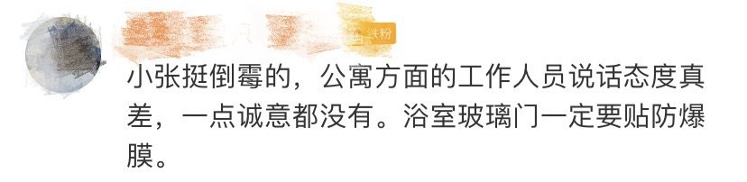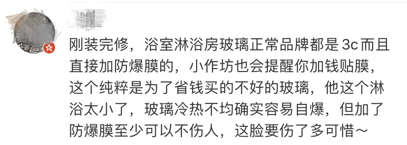 但物业表示采购的玻璃都是合规的,之前也没出现过玻璃自爆现象。物业工作人员称,可以补偿小张一个月的房租。对此小张不接受,可能会考虑走法律途径。消息一出,不少网友提醒,浴室的钢化玻璃一定要记得贴膜↓