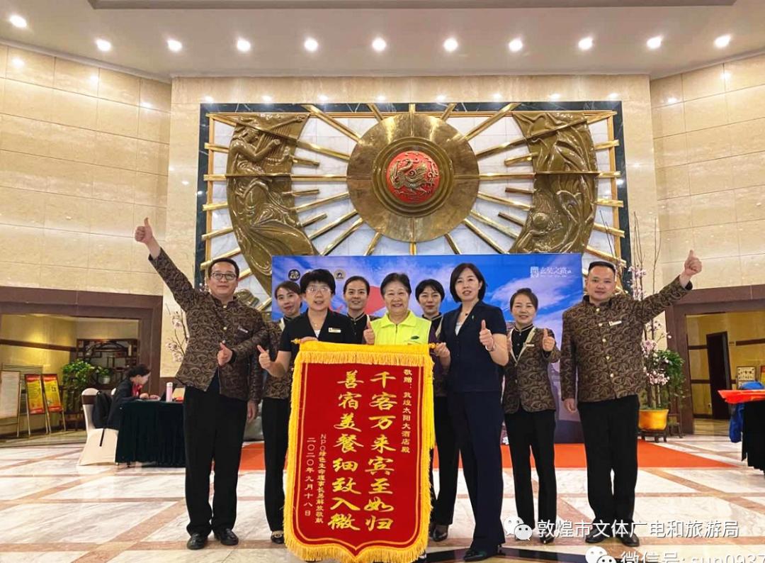 2020年9月18日,敦煌太阳大酒店收到一面印有“千客万来宾至如归,善宿美餐细致入微”的锦旗,易解放易妈妈深切表达了对太阳大酒店工作人员尽职尽责和热情周到服务的感激之情。今年四月份开始, “大地母亲”易解放女士带领NPO绿色生命团队为绿化敦煌戈壁第一期工程援建一万亩,提供援建善款1000万元用于敦煌阳关林场的造林项目,为敦煌再造新绿,保护敦煌生态环境。易妈妈带领着她的NPO绿色生命团队入住了太阳大酒店。几个月来,太阳大酒店通过接待一批又一批的志愿者,其优质的服务赢得了易妈妈和志愿者们的高度赞扬。