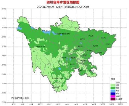 9月24日8时至20时降雨落区预报 ↑今天晚上到9月25日白天,全省阴天有小到中雨,其中盆地西部、川西高原北部及攀西地区北部局部地方有大雨。